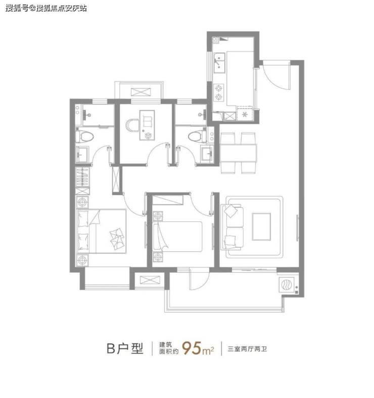 建面约95㎡的3房2厅2卫户型,可以说是刚需置业一步到位的户型,从二人世界到二胎家庭的全生命周期需求都能满足。