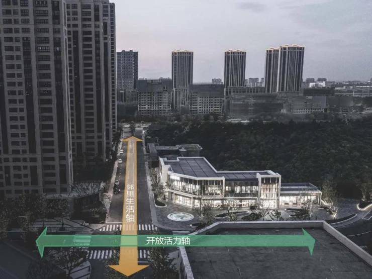 本次设计三期地块西侧道路为大盘内部最为重要的南北向社区邻里生活轴,也是重要的城市展示面。除了L形的售楼处在南北方向的展示,景墙、社区主入口也纳入整个示范区的设计,延续售楼处的造型风格,继续延展了整个示范区的城市展示界面。而地块南侧的道路则是作为东西向社区开放活力轴,联系了各地块的出入口,示范区所在的位置作为东西轴上最为关键的空间节点,建筑向北退让出广场,既作为示范区的前场空间,也将是未来社区户外活动、交流的核心空间。