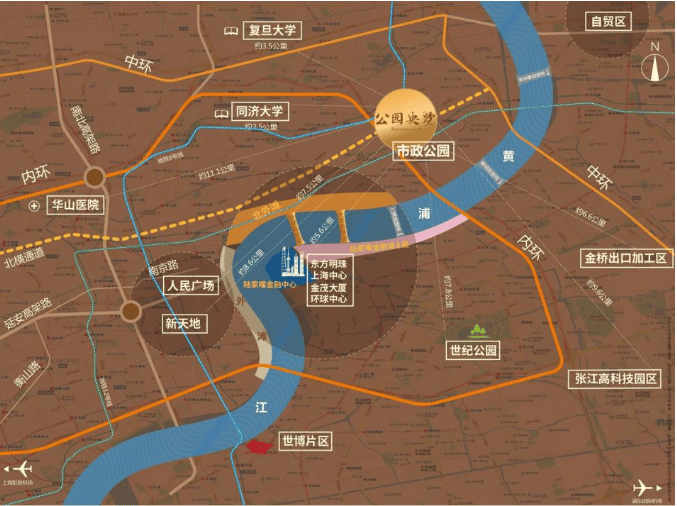 位于浦西内环旁,南靠北外滩,距黄浦江岸约3.5公里,15分钟车程直达陆家嘴商务中心。