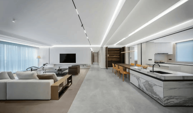 空间布局:创新设计无界方厅,LDKB 一体化布局,全封闭式阳台搭配提升推拉窗设计,让室外风光与室内空间自在流动。