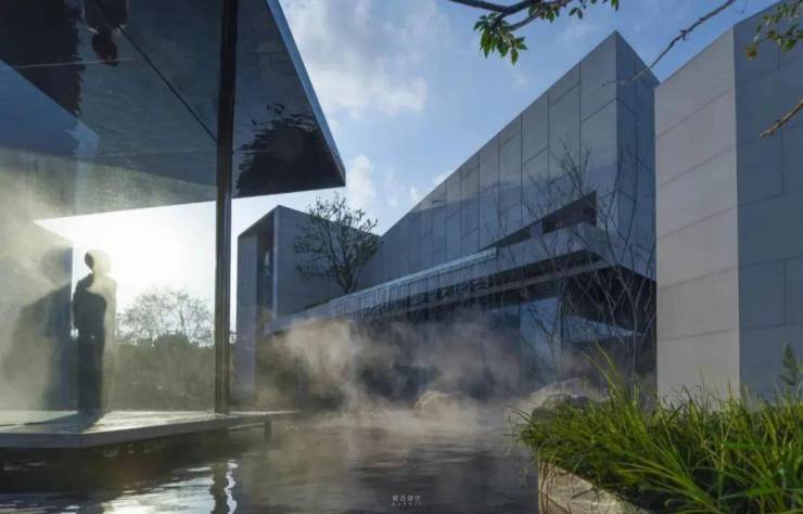 在建筑的出口,我们巧妙地结合了建筑眺檐设置了一道飞流之下的大瀑布,既洋溢着浪漫气息又富有力量感,带给人梦境般的游览体验。
