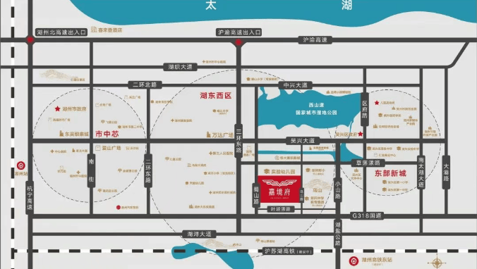 周边配套:交通方面,立于吴兴大道南侧,链接中兴大道,路网纵横,沪苏湖高铁已通车,城际交通便捷。商业方面,尽揽万达广场、自由港 CBD、爱山广场等商业休闲配套。医疗方面,直线距离约 800 米达湖州市邦尔骨科医院,直线距离约 2 公里达三级甲等专科医院湖州市第三人民医院。教育方面,举步即达湖州实验幼儿园、湖师附小(西山漾校区)、湖州四中教育集团(西山漾校区)等。