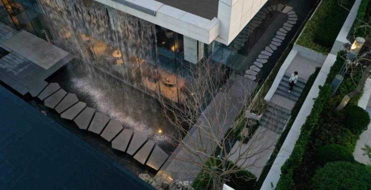 我们延续了整体的流线设计来布局花园,灵动的飞瀑,飘浮的空中绿岛、反光的镜面材料,带来如梦如幻的不真实感。