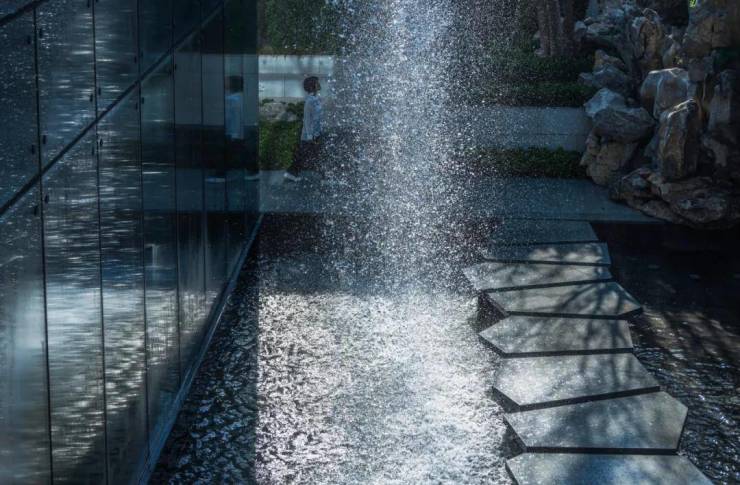 你徜徉其中,瀑布强烈的冲击感、景石的泠冽及人的柔软相互交融,阳光洒落,斑驳的光影让你沉醉。你在这里嬉戏、遇见,仿佛回到童年时候的那个最快乐的时光。