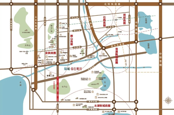 交通出行:紧邻苏福快速路与中环西线,便捷通达全城,近享地铁 3 号线、5 号线。长江路隧道穿越七子山及吴中大道后,通过旺山路与太湖隧道相连,可快速到达城市各主要区域1。