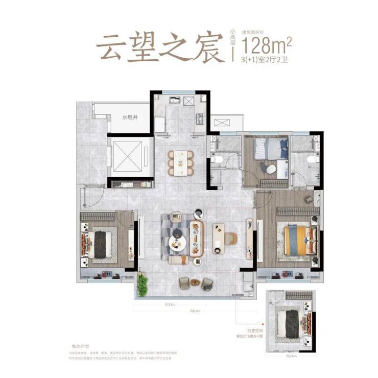 建面约128㎡的户型,约6.4米宽厅的景观阳台+落地窗设计,其中让业主享有约270°阔景视角,主卧带卫生间的设计,私密性也更强。