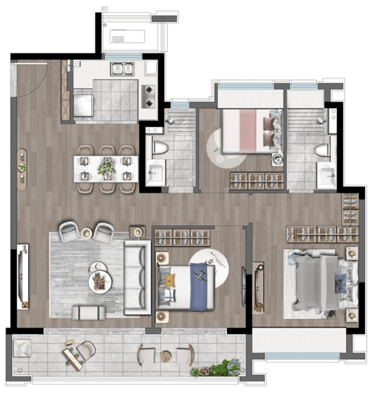 还有建面约118㎡爆款,三房二厅二卫,得房率非常高,阔奢大三房,摸透了刚改的底层需求,以超级尺度犒赏每一位家庭成员。