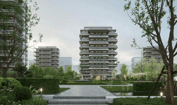 规划设计:项目规划布置20栋高层住宅,层数在12F-17F之间。楼宇采用错位布局的方式,形成"城市森林岛屿"的视觉效果;在地块内部围合1000㎡中心景观花园,同时融入苏州园林造景手法,形成户户享有立体庭院景观,实现"推窗见绿"的生活体验。