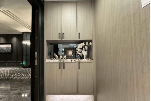 124 平方米四房:两南两北布局,整体采光通风佳。有独立玄关,入口处约 2.5 平方米,方便收纳。北向小房间可改造为书房、儿童房或保姆房。还设置了中西双厨,除传统中厨外,有约 4 平方米的西厨岛台。
