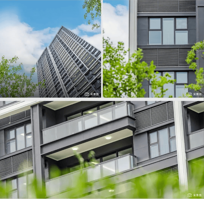 项目外立面采用大面积玻璃幕墙,铝合金线条、金属格栅和大面宽、环幕视野的Low-E玻璃,交融出一片迷人的高级灰,尽显高端社区的大气华丽。