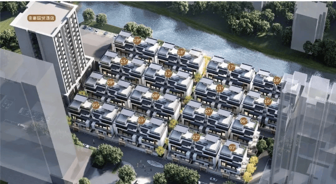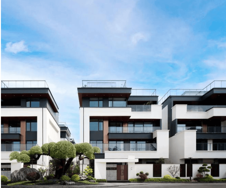 外立面:采用高级灰和白色经典搭配,穿插古铜色的铝板提升质感,大面积使用落地窗和露台,呈现出现代简约的光感外立面,使建筑更灵动轻盈。