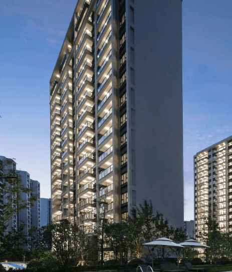 建筑设计:从法式新古典精神中汲取对称、庄重与华美,再植入东方生活传统与习惯,收敛了以往强烈的法式古典立面风格,取而代之的是饱和度更低的浅黄立面,糅合高级灰元素,视觉上更具现代感。