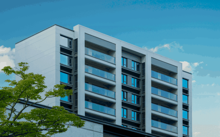 建筑风格:外立面采用银灰色仿石材颗粒涂料,整体为现代极简典雅风格,经典对称,搭配通透的玻璃,硬朗挺拔。