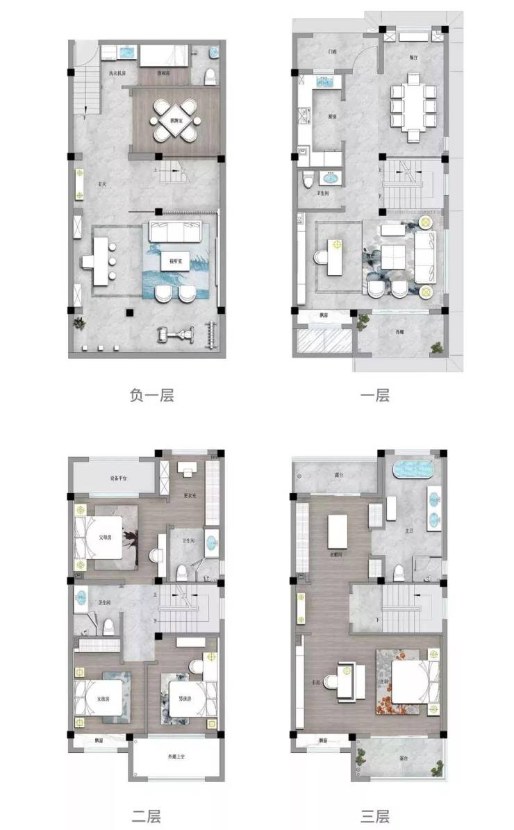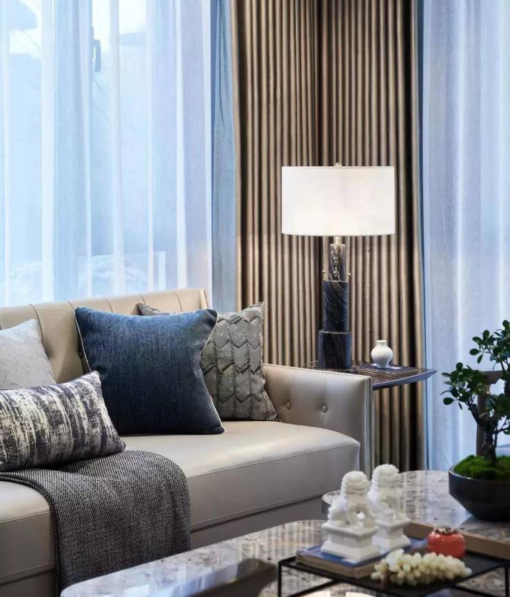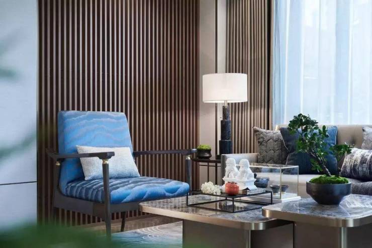 主卧套房独占一层,宽敞的卧室与卫浴间、步入式的衣帽间以及梳妆区,打造主人房礼序与尊贵并具的生活仪式。湖蓝与水墨灰糅合、木制与大理石搭配、棉麻与丝绸互映……空间所用的材质均显露着典雅的质感,现代简约形制与东方意蕴无缝融合,营造沉稳高雅的居室氛围。