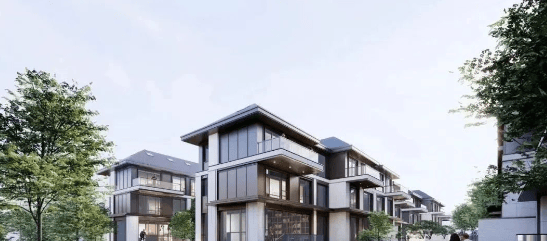 建筑风格:现代中式风格建筑立面,线条简约、质朴,注重流线性,有中式风格点缀。外立面 1-2 层选用干挂石材、铝板线条,顶部有灰色坡屋顶设计,搭配统一的公建化玻璃窗,美观典雅。