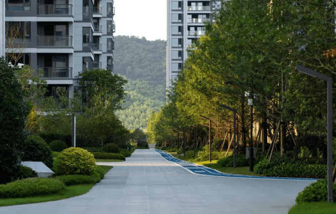 在高层和合院之间打造了一条约 300 米的娜塔栎树阵,二期最北面有樱花大道。小区内部还规划有全龄段儿童天地、景观会客厅、主题架空层、阳光草坪及游廊、回环式健康跑道、滨水游步道等设施,满足业主休闲需求。