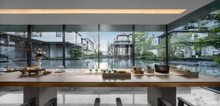 闲庭回廊后,悠然见碧湖。低密住区中罕见的双中心水院,与品莹剔透的现代玻璃建筑相映相融,临水观照,品茗舒体,逸趣自生