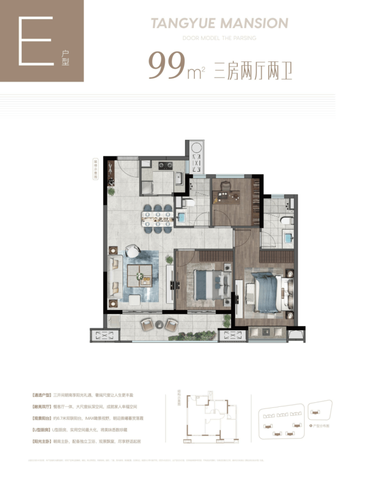 以荣安·棠樾建面约99㎡三房两厅两卫户型为例,整个户型南向开间达到了约10米,让南向三开间的起居生活满溢阳光,约6.7米阔景双联阳台,更是视野开阔,小区花园景观尽收眼底。阳台、餐厅、客厅贯通设计,较短的动线,将生活、会客、娱乐融为一体。