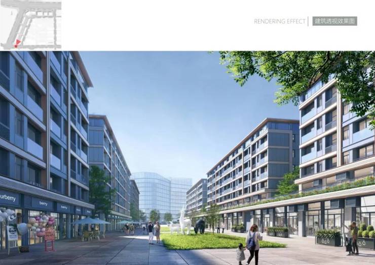 建筑风格与配套:现代简约风格,商业沿主干道展开形成连续界面;住宅呈两列平行布置,围合出内部商业内街与集中景观绿化带;配套含社区底商、商务会所、消控中心、全龄架空层活动区