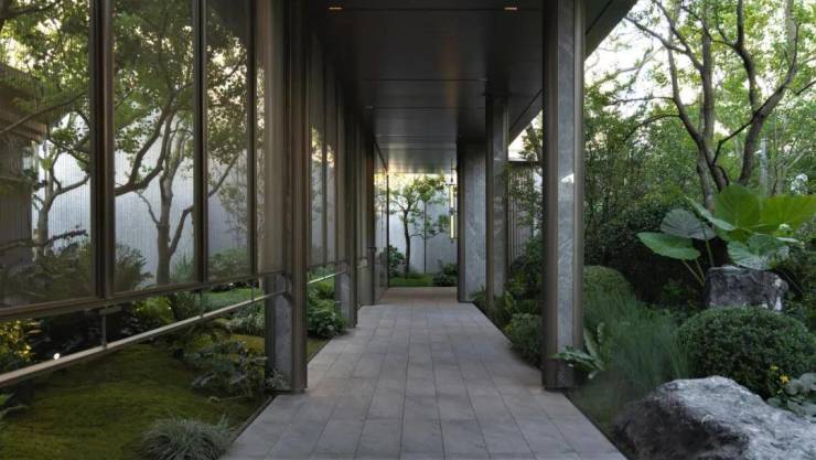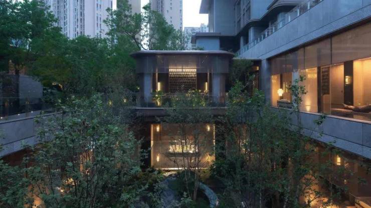 依偎在建筑和绿植中的下沉庭院,提取了江流的流线形态,用现代手法模拟山水之形,实现自然渗透的立体庭院景观。