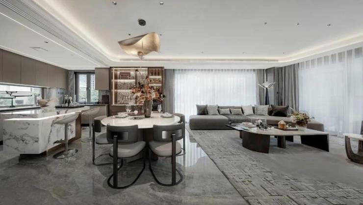 半围合布局会客厅,营造出一种私密与尊贵的氛围。上下层景观联动,带来视觉上的延展与层次感。典雅的色调及材料的自然纹理镌刻空间的奢华。文化符号的引入,使整个空间更具深度与内涵。