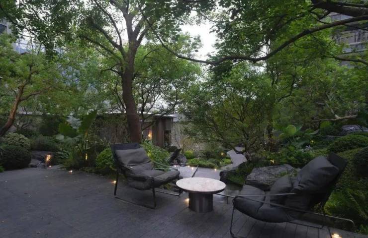 后场空间为三进隐奢庭院,以构筑、景墙形成框景,游园如观画。苍翠树林、自然置石与氧气会客厅围合而成的归家花园,带来极致的隐奢感。