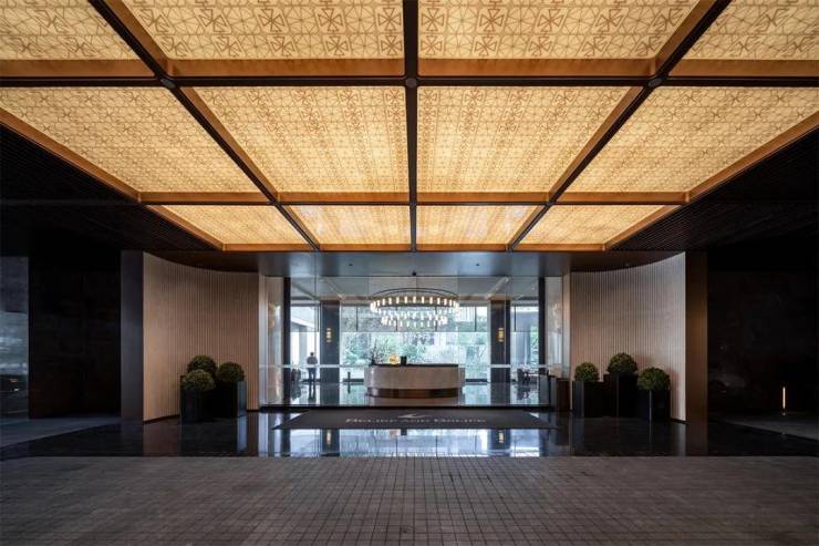 人行入口拾级而上,照壁后别有洞天。静谧水院,以千里江山图的起伏节奏演绎入海观潮的水景效果,廊苑间复现江湖水韵。奢石屏风,缝隙间下沉庭院若隐若现。