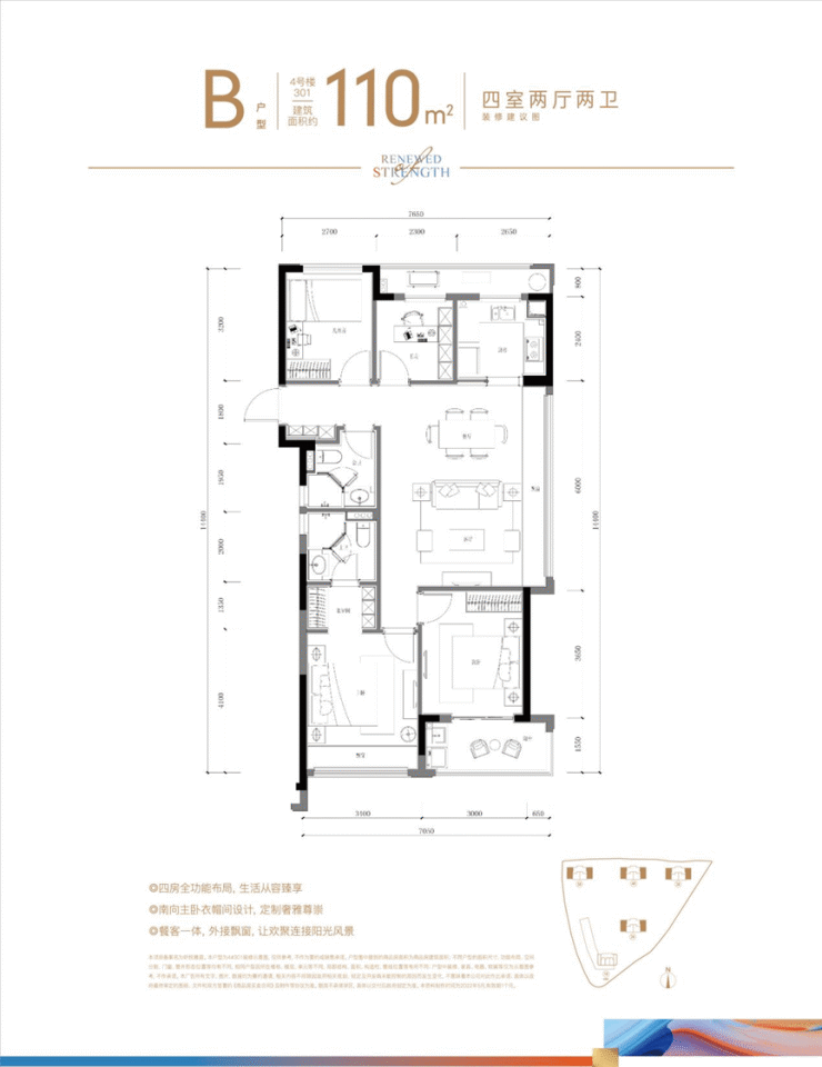 而110㎡四房设计,餐客厅一体,空间感强;南向双开间,客厅带飘窗,主卧套房设计带走入式衣帽间和卫生间,次卧则带阳台,北面为儿童房和书房。功能区分合理,对于二孩家庭来说也依然实用,同时保证了生活品质。