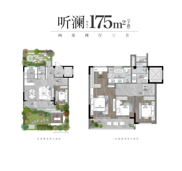 下叠一层拥有一间独立的南向房间,可作为老人房使用。所有卧室全部朝南,光线充沛,通风更好,住起来舒适性更高。