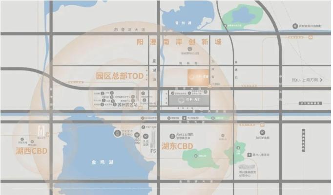 项目地处阳澄南岸创新城,紧邻金鸡湖CBD,约3公里内覆盖苏州中心、久光百货、圆融时代广场等核心商圈。地铁3号线方湾街站上盖,5站直达苏州中心,8号线(在建)3站可达久光,未来还将接入11号线、14号线等,实现5轨交汇,交通便捷。