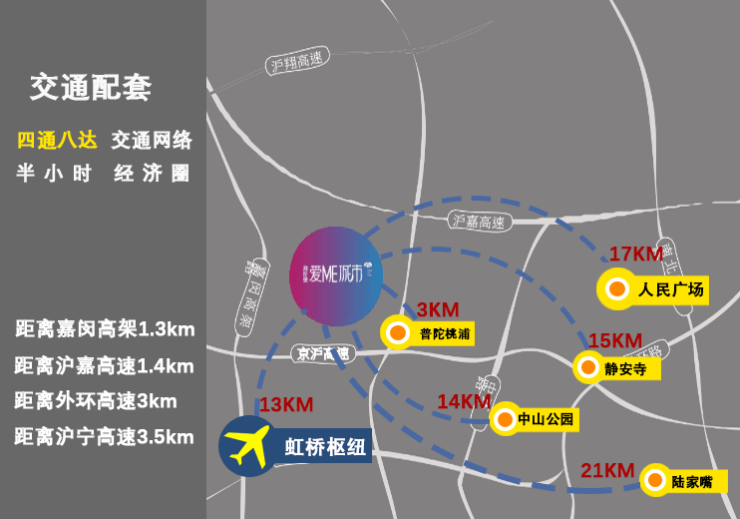 交通方面,四通八达立体交通网络;5分钟可上嘉闵高架、20分钟直达虹桥交通枢纽、30分钟可达徐汇和前滩太古里商圈。
