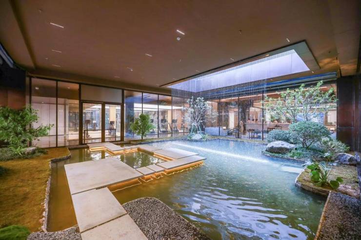 进入小区,二进礼序映水探镜独具特色,闲步而过,影影绰绰,藏匿古韵 。仿宋宫廷灯的淡雅引导,回形如意扣的延绵不绝,一旁清雅水院,方寸之间纳天地入心,道法清朗 。小区的入户大堂更是将宋韵文化展现得淋漓尽致,摆放着宋代五大窑和瓯窑,展示着宋韵的文化魅力 。大堂的二楼是私宴厅,业主在此不仅能与朋友推杯换盏,还能将七进华堂归家动线里的第三进 “游园” 尽收眼底 。整个小区的建筑与景观设计相互融合,从大门到庭院,再到室内空间,每一处细节都精心雕琢,让业主仿佛穿越时空,置身于宋代的风雅世界之中 。