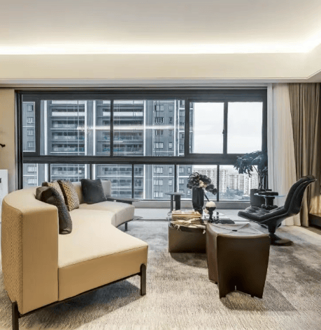 建筑外观:建筑外立面采用公建化处理,材质选用深灰色铝合金线条、金属格栅和大面积的玻璃幕墙,融入苏州园林传统的 “博古架” 元素。