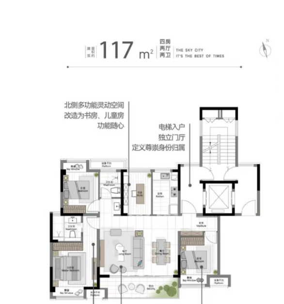 洋房户型:建面约 117㎡、128㎡,一梯两户,得房率较高,户型设计注重空间的舒适性和私密性。