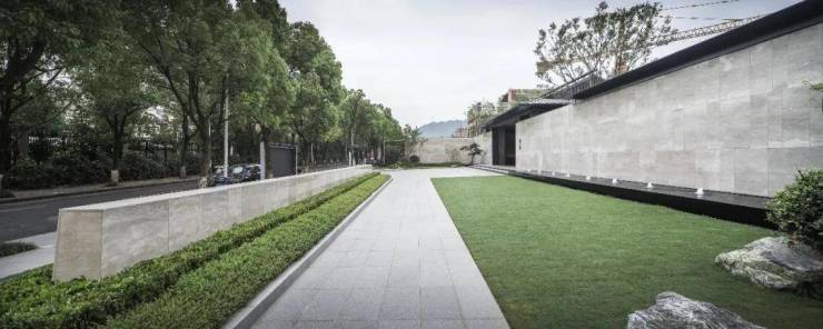 前场借会稽山为远景,在原有红线的基础上,将入口花厅和景墙进行了谦虚的留白退让,形成敞开式迎宾空间,东侧浣江路的香樟行道树自然形成前景。将停车区设置于前场的北侧,引导来访者沿着路径望向视线尽头的会稽山。以宋代歇山顶为原型的入口花厅,高7.34m,檐口长18.4m,宽12m,与端景处的灌木球和迎客黑松,在水平延展的围墙前,构成一幅不施繁饰、自然典雅的中式画卷。