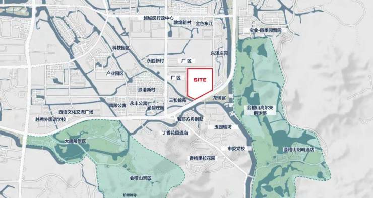 第一次来勘地,离基地还有几公里,已经能看见葱茏的会稽山和其上矗立的大禹像。这个区域由于景区的视线控制因素,有严格的建筑高度限制,周围的建成区域均是掩映在绿荫之中,与会稽山古老而宁静的姿态并存。基地东临浣江路,北至嵊山路,南侧与绍兴二环路留有米宽的绿带。东侧、北侧道路都有种植时间久、姿态茂盛的双侧香樟行道树,给予基地优良的微观现状环境。