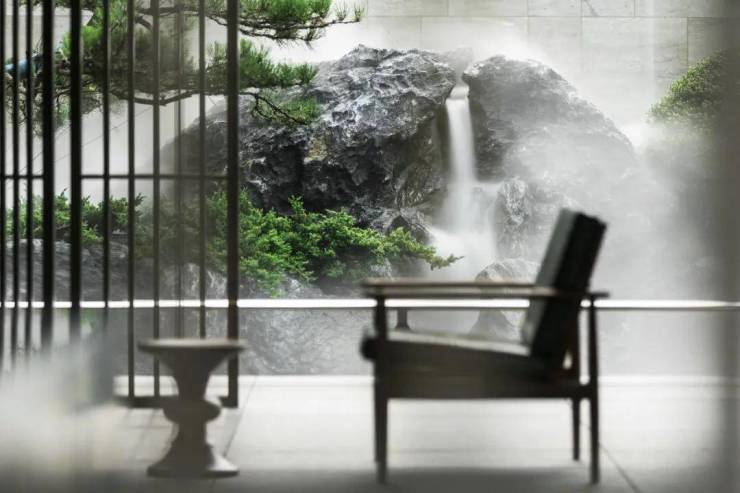 最早流传于东晋文人士大夫归隐山林后的“曲水流觞”雅集,成为了二进空间的索引。我们通过在磐石装置上模拟出纵横曲折的水道,相仿古人洒脱飘逸的饮酒作诗之意。来水无影的水轴被视为整个项目的起始水源,引伸至门洞外,串联起高下动静相化的山泉瀑布意景。山涧自上流下,伴奏出一曲“松间问泉”的叠水清音。