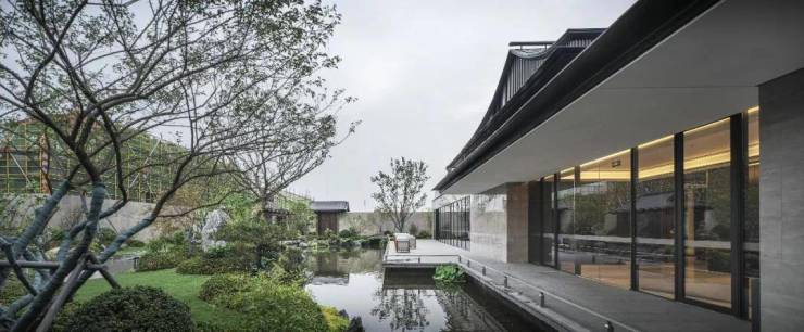 绕过柴扉,或顺着花厅外的曲尺游廊,抵达东侧的露天池台,是前一进空间蓄势铺垫下,有着强烈尺度对比的水岸洽谈区。与池台对视成景的花木小径横陈于水岸眼前,全景式的构图,层层积染出以会稽山为远景,花厅柴扉为中景的立体画卷。设计营造一镜天开的中心平池,使得两岸仅8米多的水距,与天空共显一色,横斜疏影于水面,创造出以小见大,超越物像更大自由的宽广之感。坐于岸边谈天闲吟,心情盎然平静,似与万物同娱。这一方水池也自然地将未来业主的归家流线与外部使用分隔开,而在视觉上又相互因借。