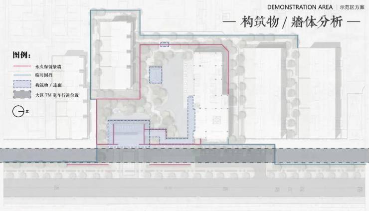 在最早的建筑总图中,示范区是一个矩形,北侧是二层的社区经营性建筑,整个项目的主入口构筑物位于矩形用地南侧的中间位置,并外凸于围墙之外,是一个非常建筑感的形体,进入之后开门见山,一眼可见水面为主体的庭园。几经推敲之后,我们对总图进行了优化调整,将主入口南移并后退,取消了南侧两栋联排住宅,在矩形主庭园之外增加了一进空间,同时将展示围墙南北双向延长,从原来的67米增加到85米。