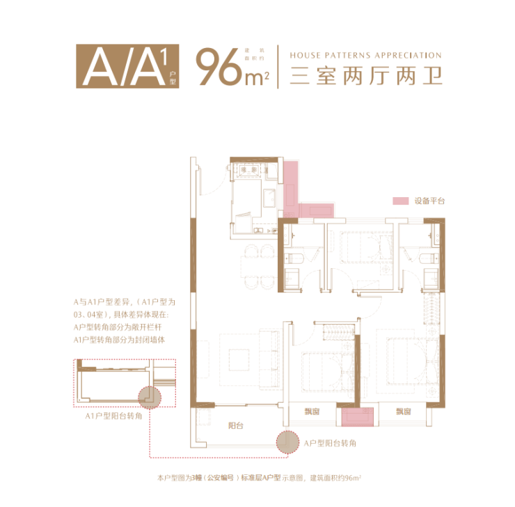 本项目备案名:璟禧云庭(北区住宅),璟禧生活广场(南区整个地块含住宅),璟禧商务中心(北区超高层+办公+沿街商业),开发商:苏州骏恒房地产开发有限公司;本户型图为3幢楼(公安编号)标准层A户型图,建筑面积约96平米,建筑面积为估算,相同户型单位因楼栋、楼层、单元等差别,局部结构、细部尺寸,面积等可能不同;户型图中的装修装饰、家居布置、空间布局等仅为示意,不作为实际交付标准或合同样品;本资料仅为要约邀请,不构成出卖人的要约或承诺,买卖双方的权利义务以双方签订的《商品房买卖合同》及其补充协议为准;相关宣传内容不排除因政府相关规划、规定及出卖人分期规划、未能控制等原因而发生变化,如有修改、调整恕不另行通知,敬请留意最新宣传资料。