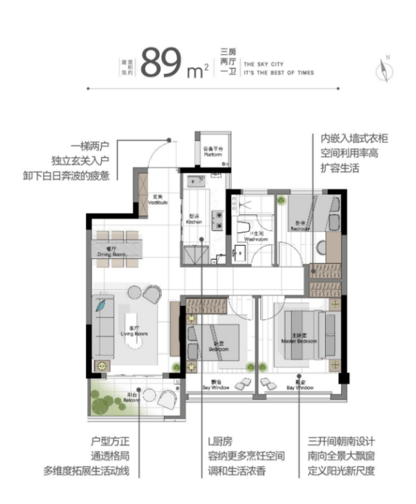 小高层户型:有建面约 89㎡、107㎡两种,多为两梯四户设计,户型方正,空间利用率高,客厅与餐厅相连,采光通风良好。其中 89㎡户型三开间朝南,动静分区合理。