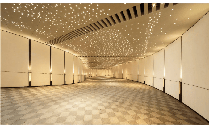 屋顶:延续宋代歇山顶形制,屋面曲线采用宋代举折构造,轻薄现代,屋脊以鎏金边勾勒,细腻精致;