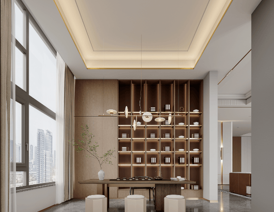 分段式的空间布局,让建筑结构渐入隐约的状态,于通透之间形成空间对话,以东方之诗意若隐,回应现代主义之阔达,呈现平静自然的摩登东方气质。