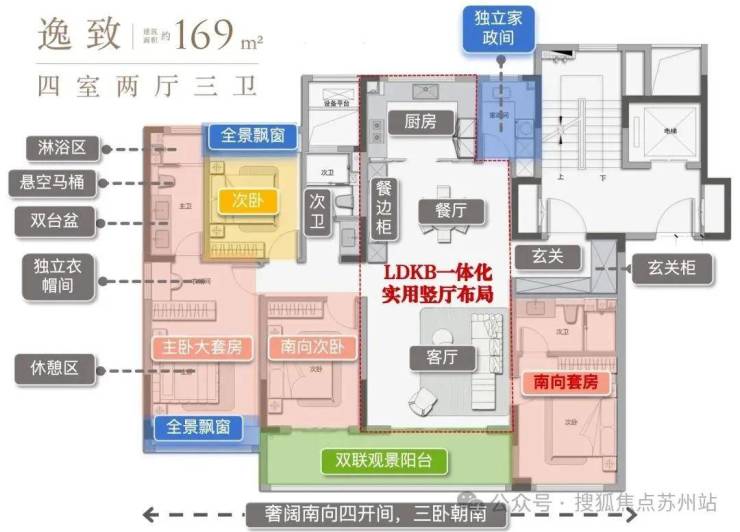两梯两户,独立电梯前室,玄关1200库收纳空间,朝南带约12.5米三联阳台,中西双厨配岛台、带家政间;