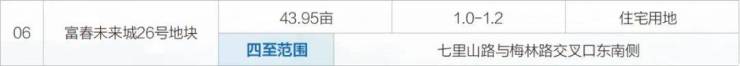 此外,富春未来城26号地块(编号6)同为低密地块,容积率仅1.2。上述4宗地块均临近长深高速桐庐互通、高铁桐庐站,可便捷沟通杭城核心区,周边更是围绕着桐庐银泰城、富春未来湖生态公园、商业水街、在建三甲医院、叶浅予建兰学校、华师大双语幼儿园等城市核心配套,品质生活有保证。
