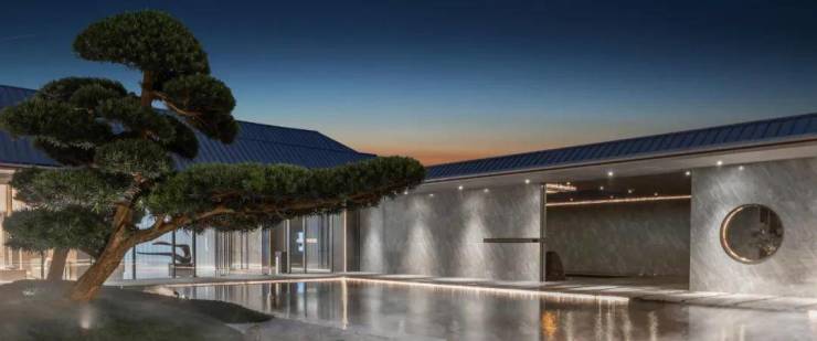 将外围空间界面化零为整,墙体与门厅做了一体化设计,延展成70余米的展示界面。并有意识的将一面墙进行倾斜和退让,让内外空间隐约渗透。半藏的空间与精细化手法强化了进入门厅的美好期许,顿足内望,隐见清泉潺潺,松枝苍劲,心理变化油然而起。