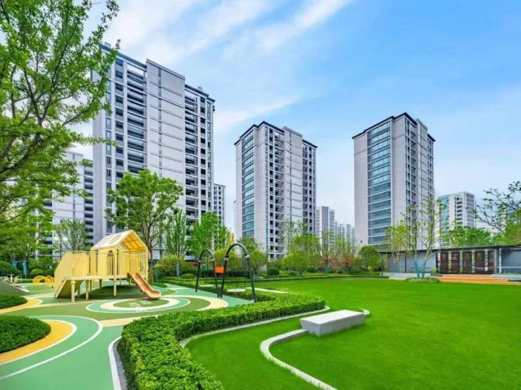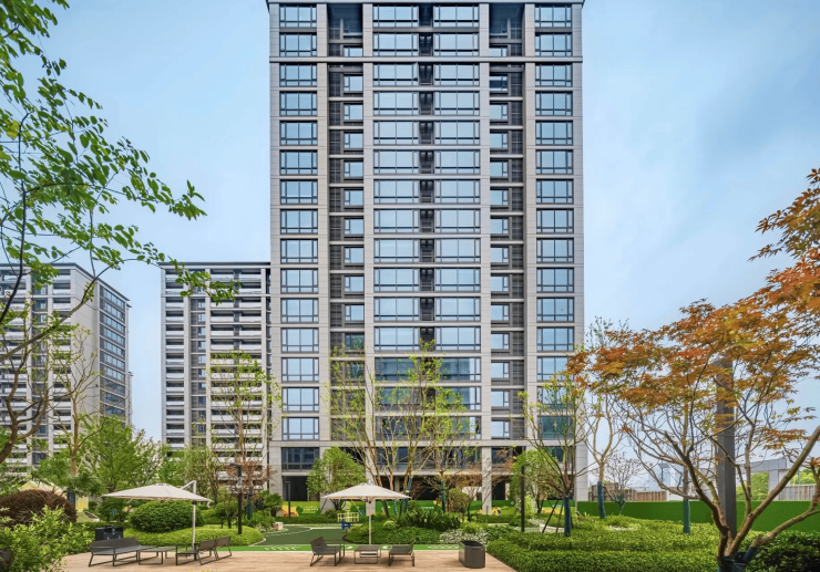 外立面与精装:洋房采用石材 + 仿石漆 + 大面积玻璃,新中式风格;精装标准约 3500 元 /㎡,中央空调 + 地暖 + 新风系统三大件标配,方太厨电(含洗碗机 / 蒸烤一体机)、杜拉维特 / 汉斯格雅卫浴,德施曼智能锁。
