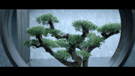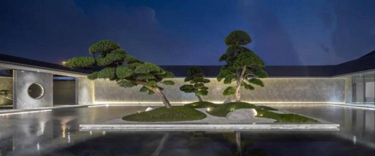 内院中心是三棵精心裁剪的巨大松树盆景,白色石台作为基底,使盆景宛若“漂浮”于水面之上。行走在回廊之下,随着视线的移动,松、水、影在曲折回转间呈现不同的景致。