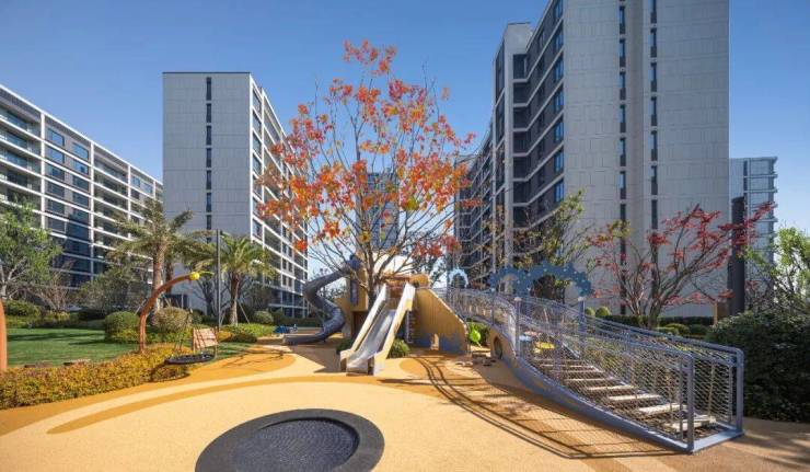 园区之内,更是全龄生活的剧场。孩子们在以“摇橹泛舟”为灵感的儿童乐园里探索自然——滑梯、秋千、沙坑,以及融入其中的植物迷宫,都是他们撒欢的天地;开阔的阳光草坪上,野餐、放风筝、追逐嬉戏,充满生活气息的画面每天都在上演。