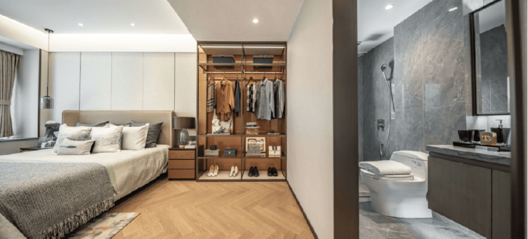 为提升主人居住的尊荣感,江山和悦府建筑面积约109㎡户型套房式主卧,以“豪华阵容”焕新生活想象,私属步入式衣帽间配置,是主人装扮的时尚秀场,功能性与品位感兼具;独立卫浴间,私密有度、尺度阔然,在特别的日子里,点上喜爱的香薰,音响里音乐缓缓流淌,在适宜的水温中洗去一身的疲累,也让治愈的香氛舒缓紧绷的神经。所谓优雅,大概就是以考究的方式取悦自我,无论身心。